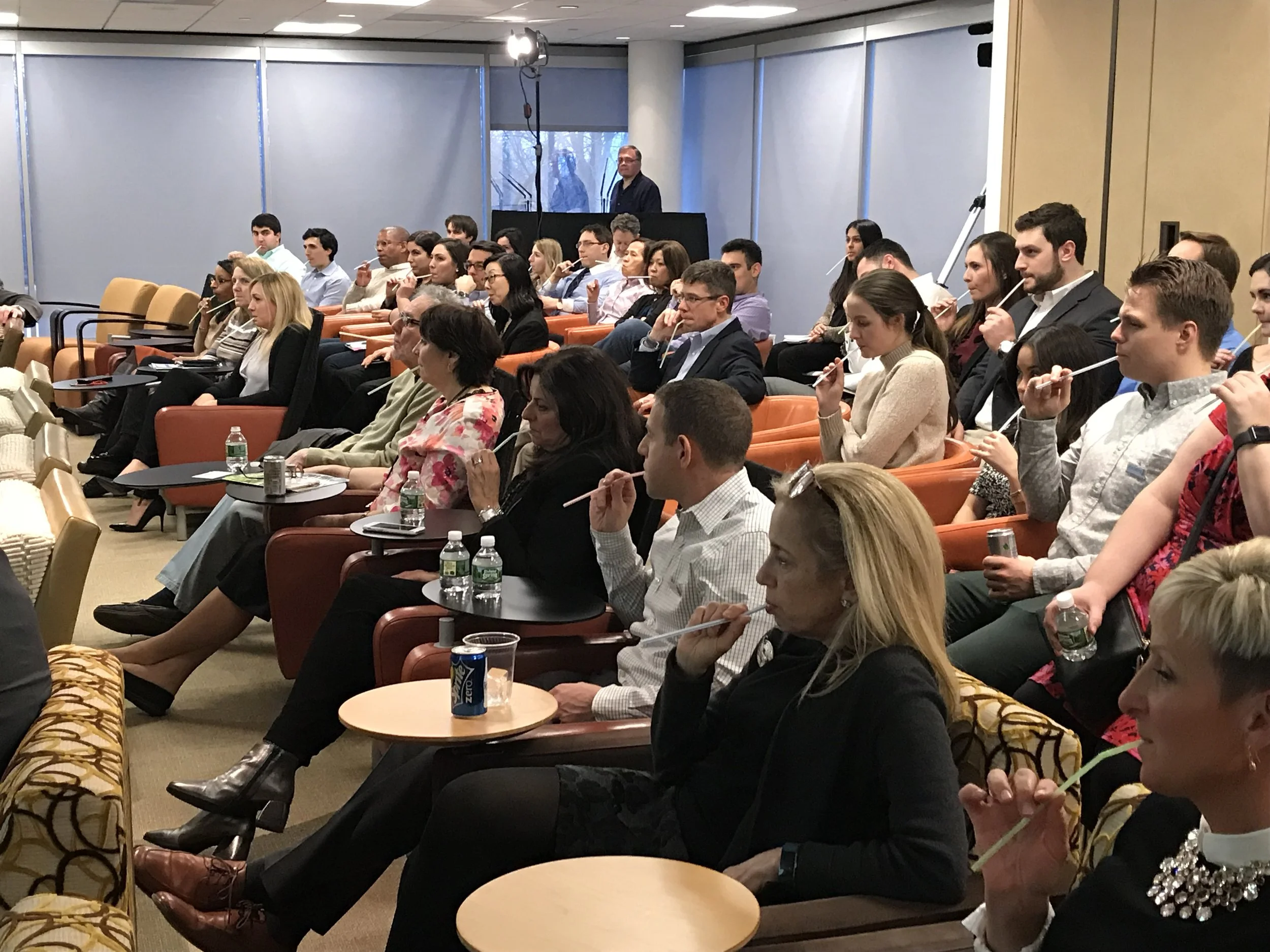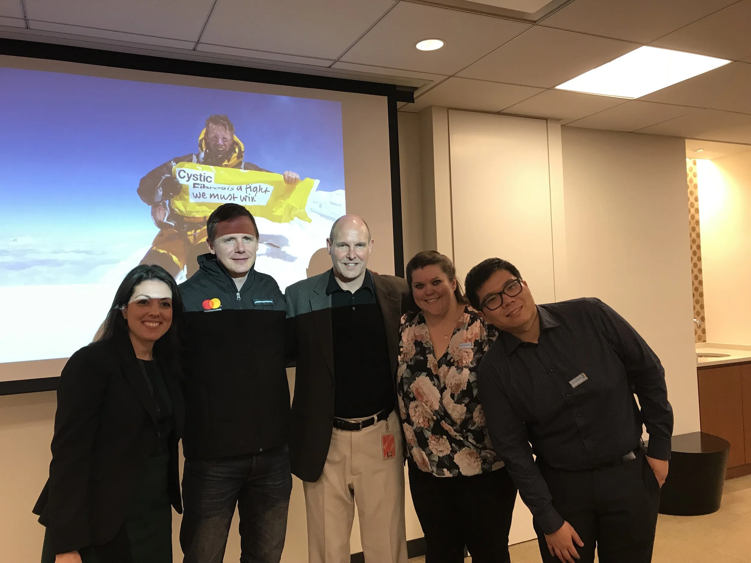Pictured: 1) Mastercard and Tomorrow’s Leaders represent at Great Strides; 2) audience members experience what it’s like having CF by breathing through straws; 3) Linda Kirkpatrick, Tim Berger, Tommy Ching & Jennifer Lowe welcome Nik Talbot to Mastercard; 4) Mastercard is honored by the Cystic Fibrosis Foundation.